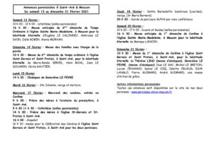 Annonces paroissiales du samedi 13 au dimanche 21 février 2021