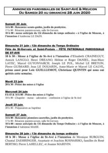 Annonces paroissiales samedi 20 au dimanche 28 juin