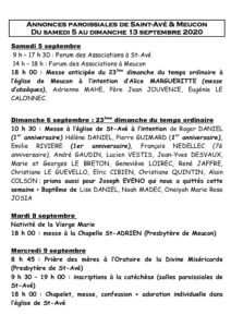 Annonces paroissiales samedi 7 au dimanche 14 septembre 2020