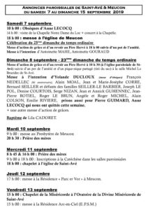 Annonces paroissiales samedi 7 au dimanche 15 septembre 2019