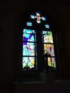 Elle vient d’être dotée de vitraux qui lui donnent une splendide lumière, dans cet écrin de verdure., où nous sommes chaleureusement invités à une prière.